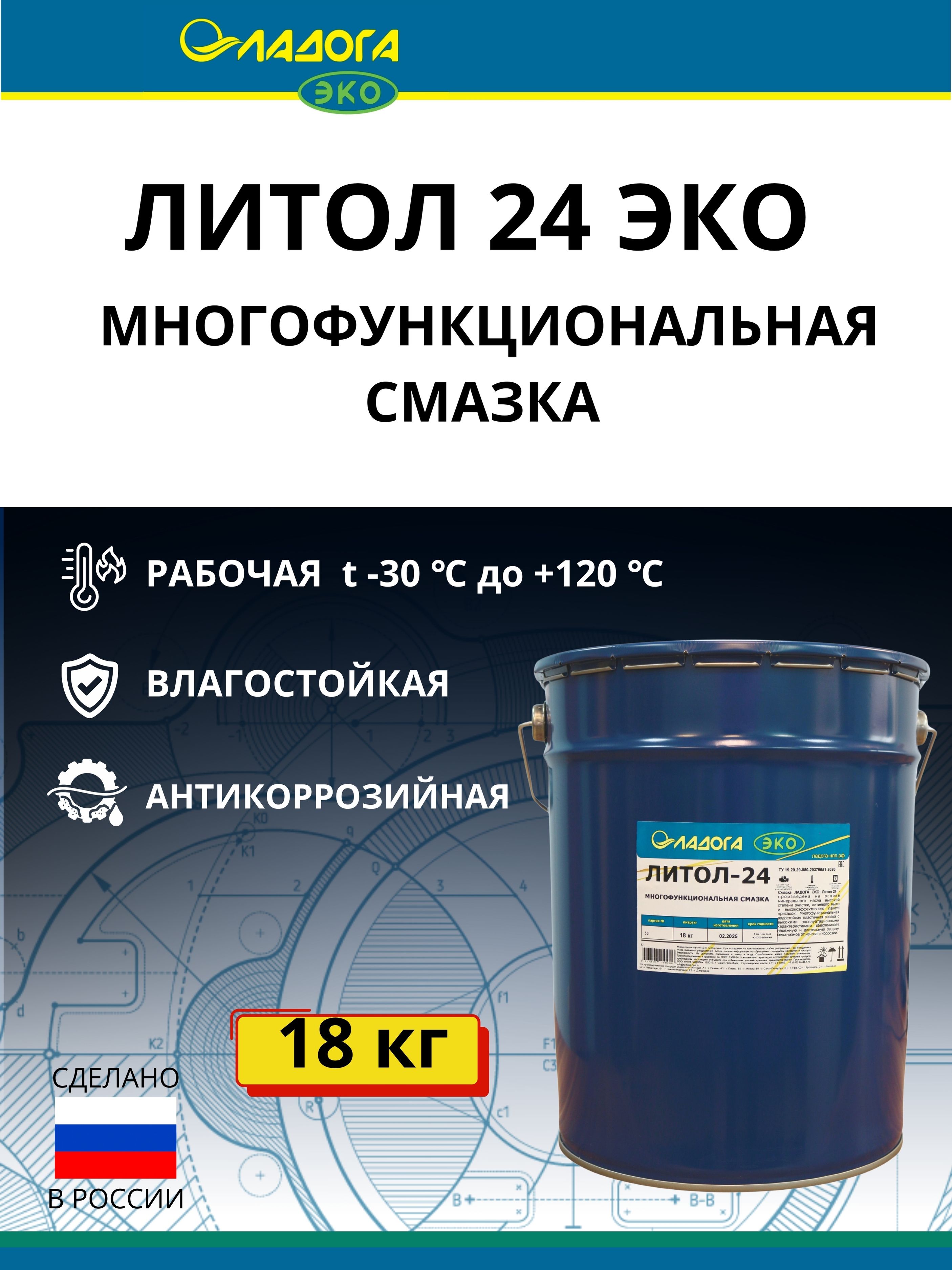 Смазка ЛИТОЛ-24 ЭКО ЛАДОГА многофункциональная антифрикционная водостойкая произведена на современном оборудовании предприятия «ЛАДОГА» на основе высококачественного минерального масла высокой степени очистки и комплексного пакета присадок с усиленными свойствами. В течение долгого времени после применения смазка минеральная защищает от влаги, препятствует коррозии. Смазка получила популярность и стала незаменимым помощником владельцев авто. Смазка минеральная ЛИТОЛ-24 часто используется при подготовке авто для прохождения ТО, эффективной обработке подшипники автомобиля, спецтехники. Также подшипников самоката SLZ, NSK, подшипник электросамоката Kugoo. Универсальные качества позволяют заменить целый комплекс более специальных смазок для обработки лебедки, тросы, катушки. Эффективна даже при отрицательных температурах. Широкий диапазон рабочих температур. Рекомендована экспертами в качестве универсальной смазки как для специальной коммерческой авто техники, судового и железнодорожного транспорта, так и для механизмов промышленного оборудования и станков. Рекомендована как смазка автомобиля и эффективный антикор. ЛИТОЛ 24 ЭКО ЛАДОГА во многих случаях может выступать как аналог смазка синтетическая многоцелевая марок Total, Castrol, Mobil, LIQUI MOLY в возможных упаковках европейских производителей ЛИТОЛ спрей и аэрозоль. Серия ЭКО, по мнению экспертов авто рынка, хороший ЛИТОЛ по привлекательной стоимости. Объем ведро 18 кг. В ассортименте ЛАДОГА есть вариант упаковки 10 кг., 5 кг., туба 400 гр.