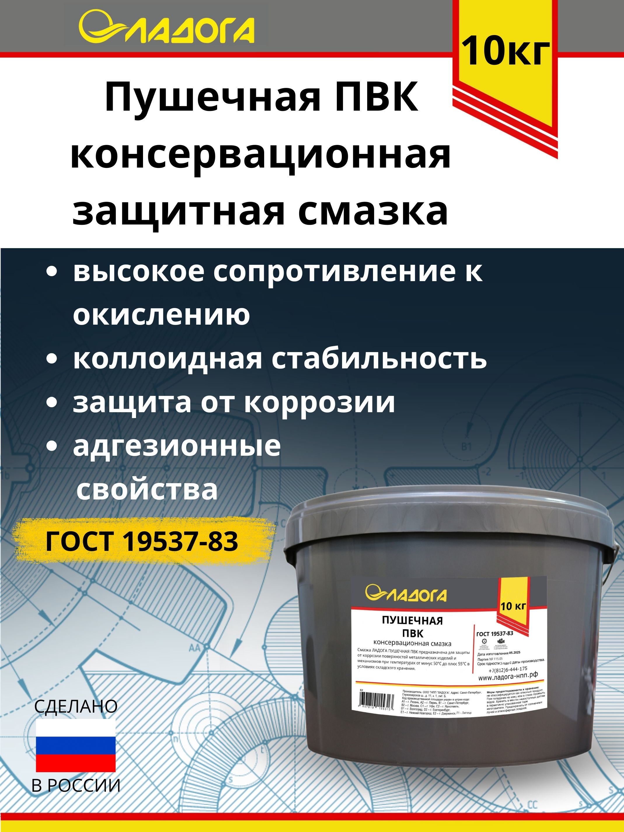 Смазка ЛАДОГА Пушечная ПВК – консервационная смазка, изготовленная из вязкого минерального масла с добавлением присадок, обеспечивающих консервационные, низкотемпературные и адгезионные свойства. Пушечное сало работоспособно при температурах от минус 50°С до плюс 50°С.Пушечная смазка предназначена для защиты от коррозии поверхностей металлических изделий и механизмов при температурах от минус 50°С до плюс 55°С в условиях складского хранения.