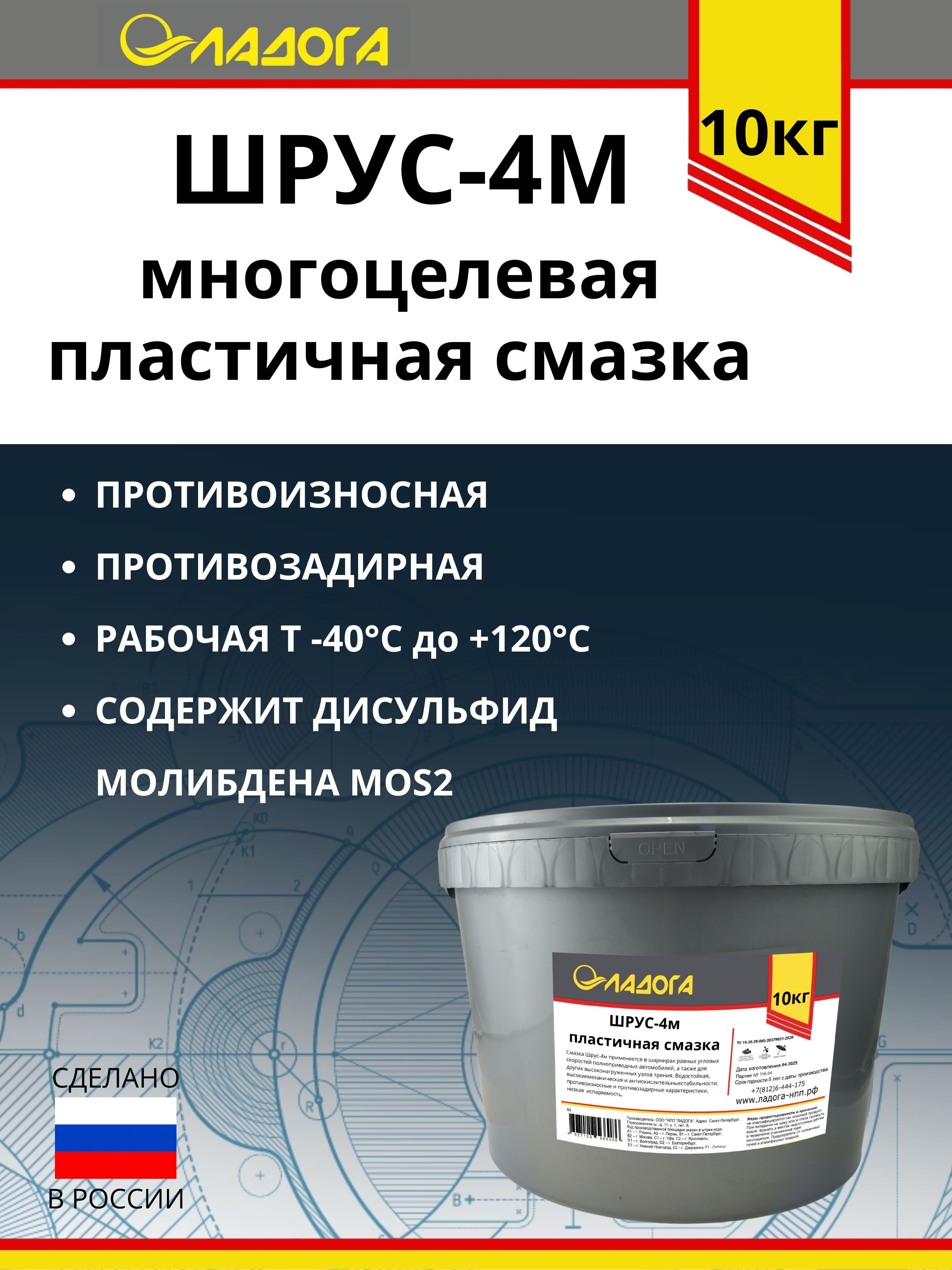 Смазка ЛАДОГА ШРУС-4М водостойкая произведена на современном заводе «ЛАДОГА» с использованием технологий и материалов нового поколения. Смазка минеральная предназначена для использования в шариковых шарнирах равных угловых скоростей и узлах трения, подверженных ударным нагрузкам и воздействию воды. Автомобильная смазка существенно предотвращает износ шарниров. Смазка для авто ШРУС 4М эффективна в качестве универсальной смазки общего назначения для промышленных агрегатов, узлов техники, работающих в условиях повышенной влажности и загрязненности: цепные приводы, зубчатые передачи, конвейеры, работающие при малых скоростях, на открытом воздухе, лебедки. Смазка для автомобиля и спецтехники ШРУС демонстрирует высокие противоизносные и противозадирные свойства. Смазка минеральная ШРУС часто используется при подготовке авто для прохождения ТО. Рекомендована экспертами как универсальная авто смазка и эффективный антикор. Смазка выступает высококачественным аналогом более дорогих по цене марок смазок: Газпромнефть, Роснефть, АРГО, ЛУКОЙЛ. Представлена в таре: банка 800 гр. В ассортименте есть смазка ШРУС -4М в таре ведро 18 кг.
