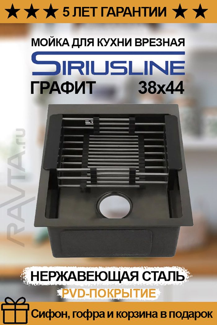 Мойки, Мойка врезная нержавеющая SIRIUSLINE 38х44 Графит без отверстий (в комплекте: коландер, сифон) – лучший выбор и лучшие цены в интернет-магазине Равта!